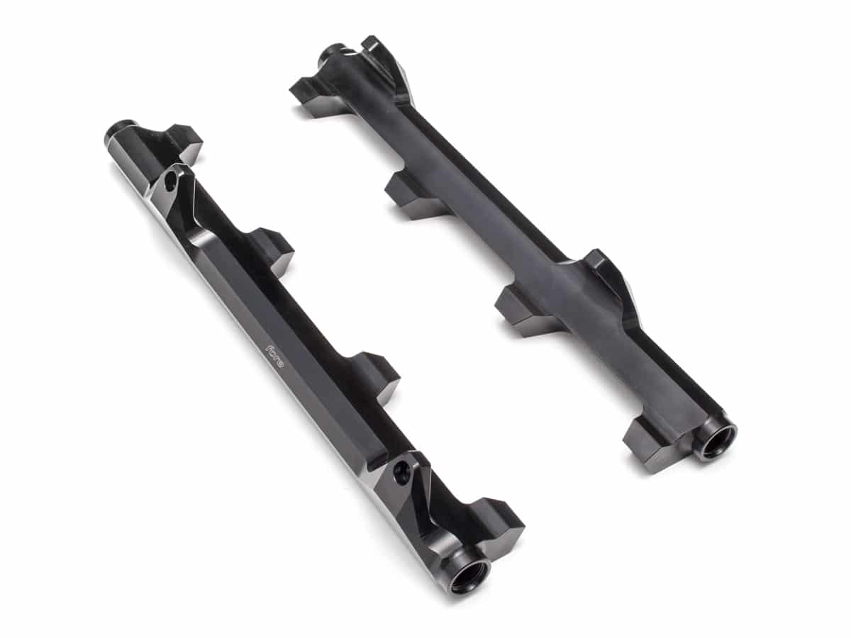 Boost Referenced Return System for 1800+ rwhp. Filtered fuel is sent to one rail first, then crossed over to the second rail, then terminates at the regulator.