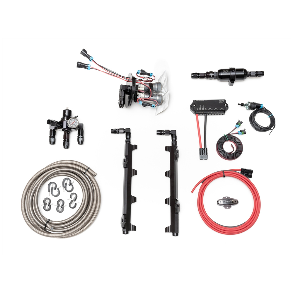 Return fuel system capable of 1000+ rwhp with dual fuel pumps. (recommend to run one pump full time, then activate secondary pump under load) Fuel rails in parallel with regulator before rails (deadhead). Includes in-tank supply system that retains OE transfer, fuel level senders, and EVAP functionality, upgraded feed and return lines, high capacity filtration and checkvalve