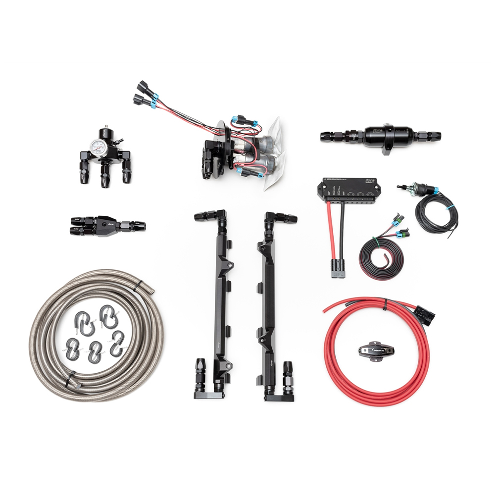Return fuel system capable of 1000+ rwhp with dual fuel pumps. (recommend to run one pump full time, then activate secondary pump under load) Fuel rails in parallel with regulator after rails. Includes in-tank supply system that retains OE transfer, fuel level senders, and EVAP functionality, upgraded feed and return lines, y-block, high capacity filtration with check valve and F2i regulator with boost reference.